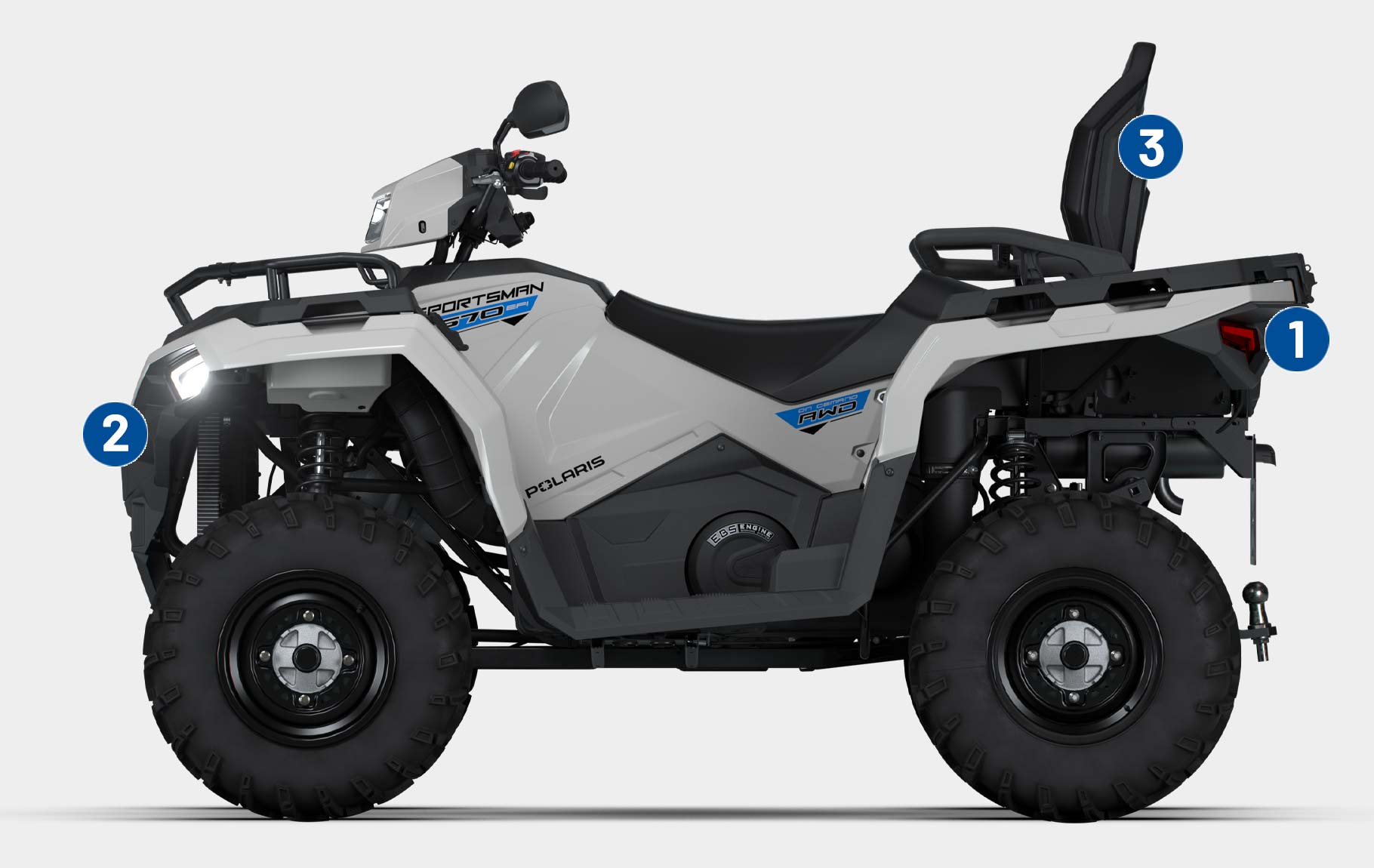 - Prise électrique 12 volts, port de charge lente intégré, pré-câblé pour chauffe-mains et chauffe-pouces, système de sécurité activé par code PIN, Rallonge de porte-bagages avant, benne basculante, protections de bras triangulaires avant et arrière